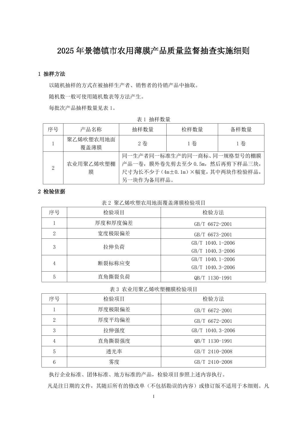 2025年景德镇市农用薄膜产品质量监督抽查实施细则
