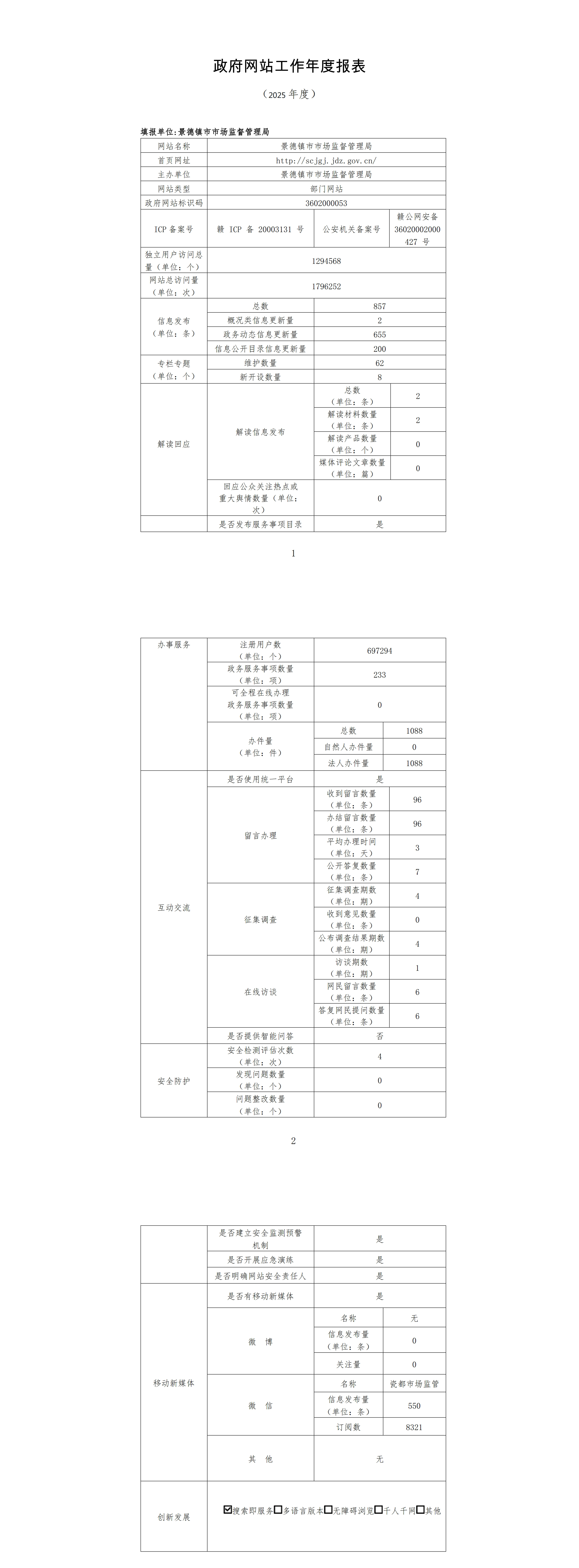 景德镇市市场监督管理局网站工作年度报表(2025年度)