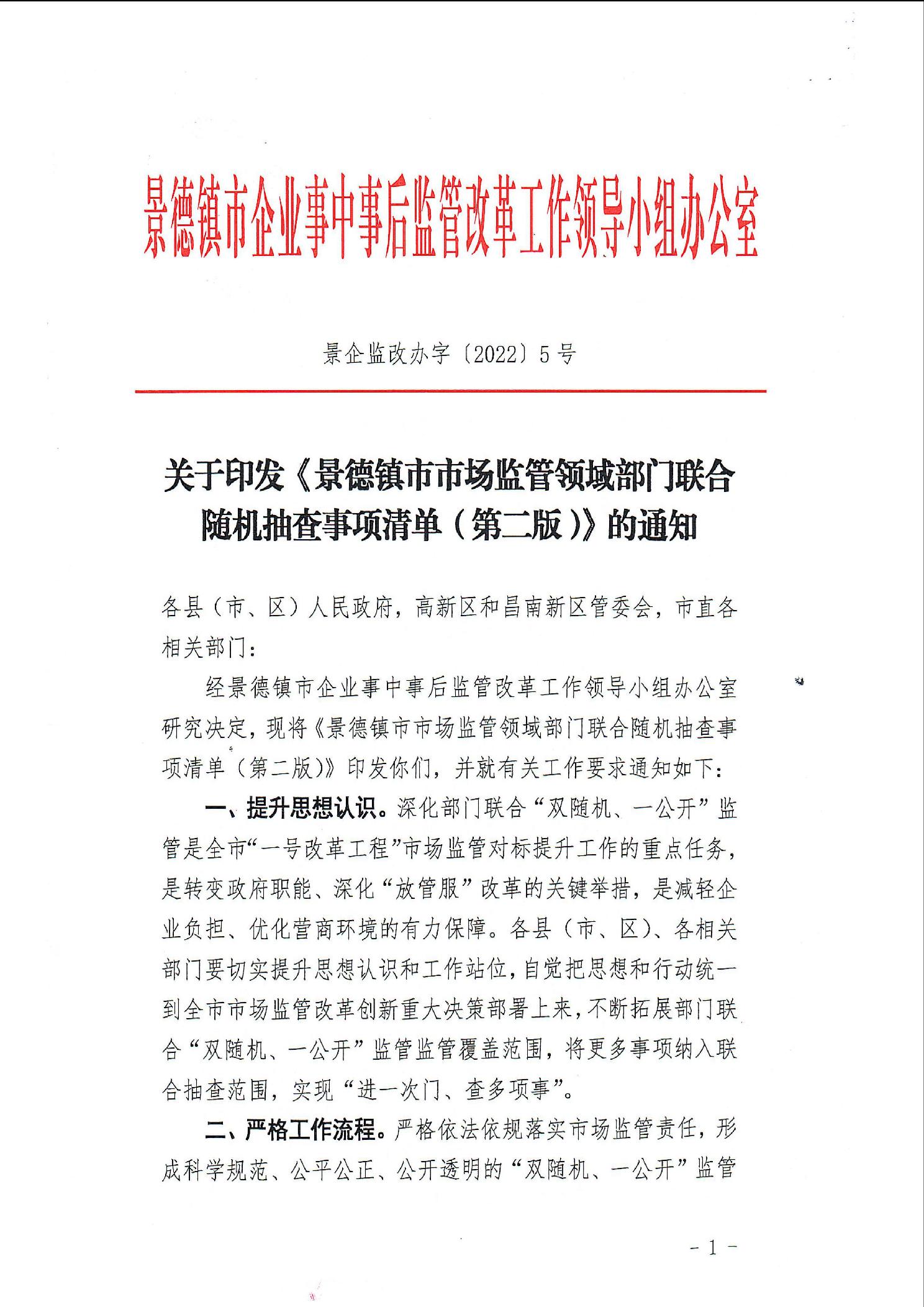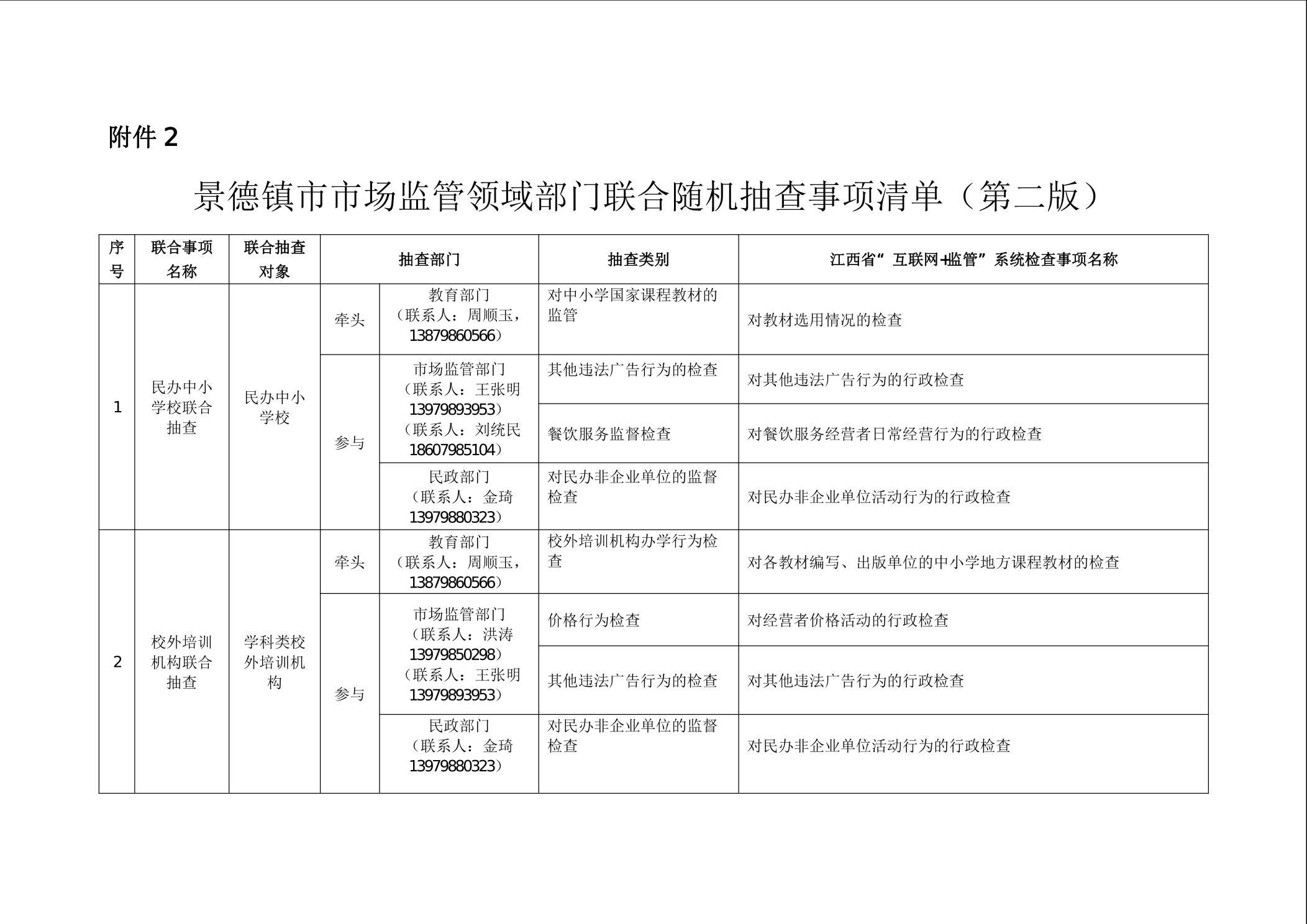 关于印发《景德镇市市场监管领域部门联合随机抽查事项清单(第二版)》的通知
