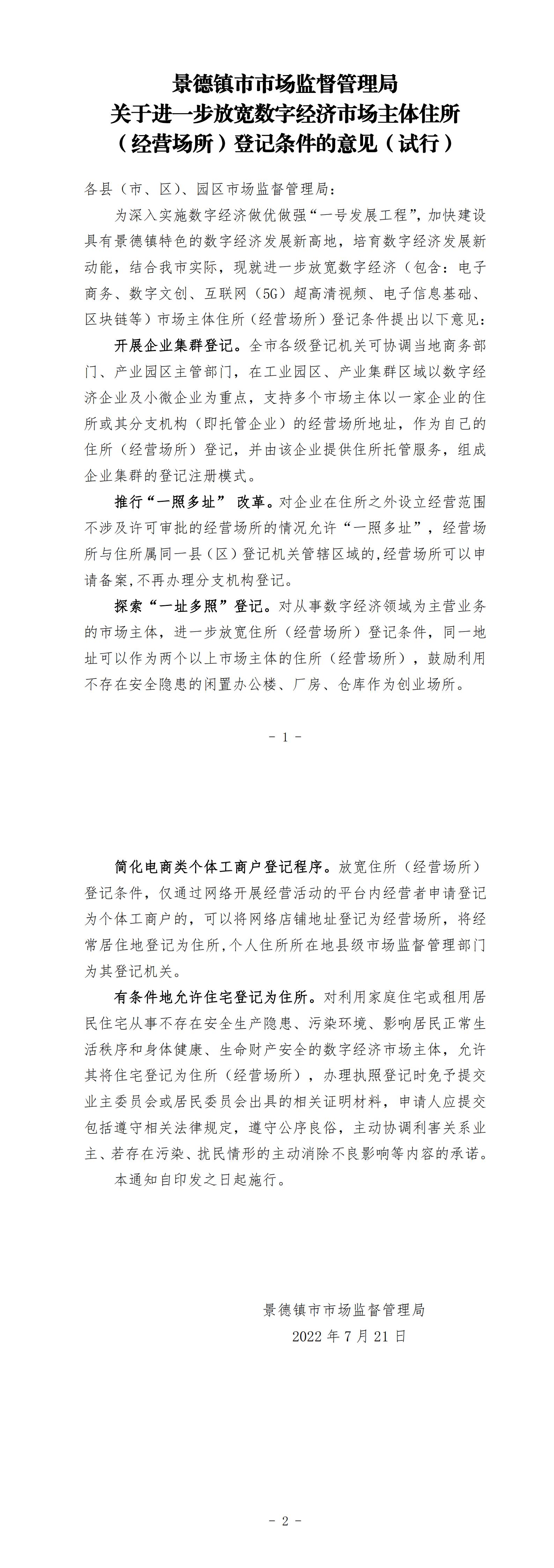 【行政规范性文件】景德镇市市场监督管理局关于进一步放宽数字经济市场主体住所 (经营场所)登记条件的意见(试行)