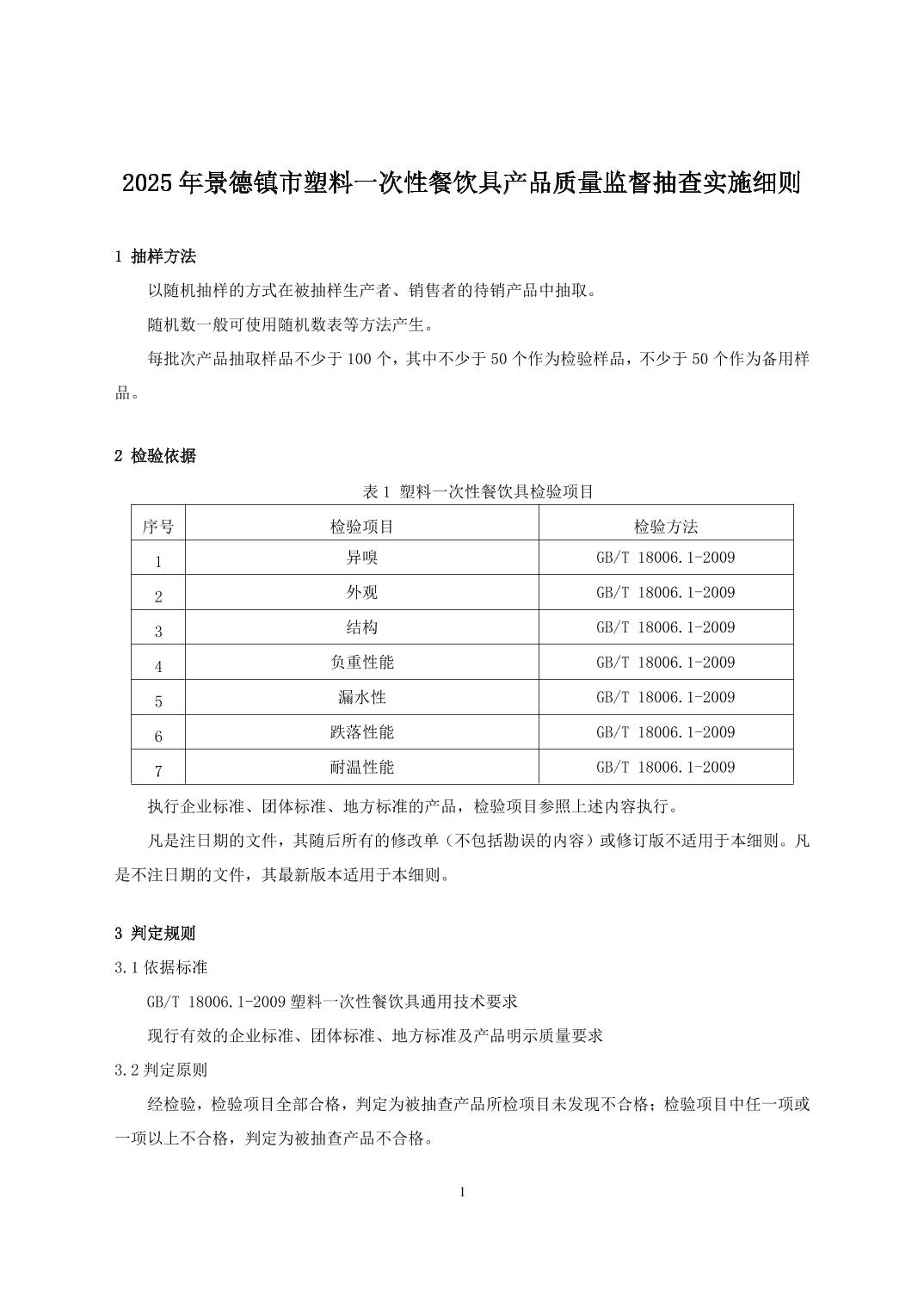 2025年景德镇市塑料一次性餐饮具产品质量监督抽查实施细则