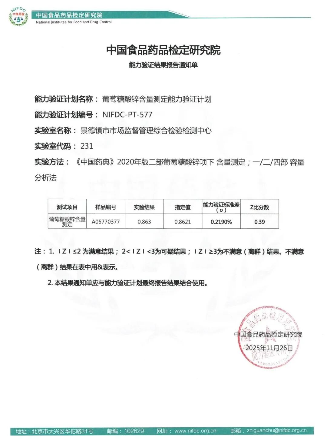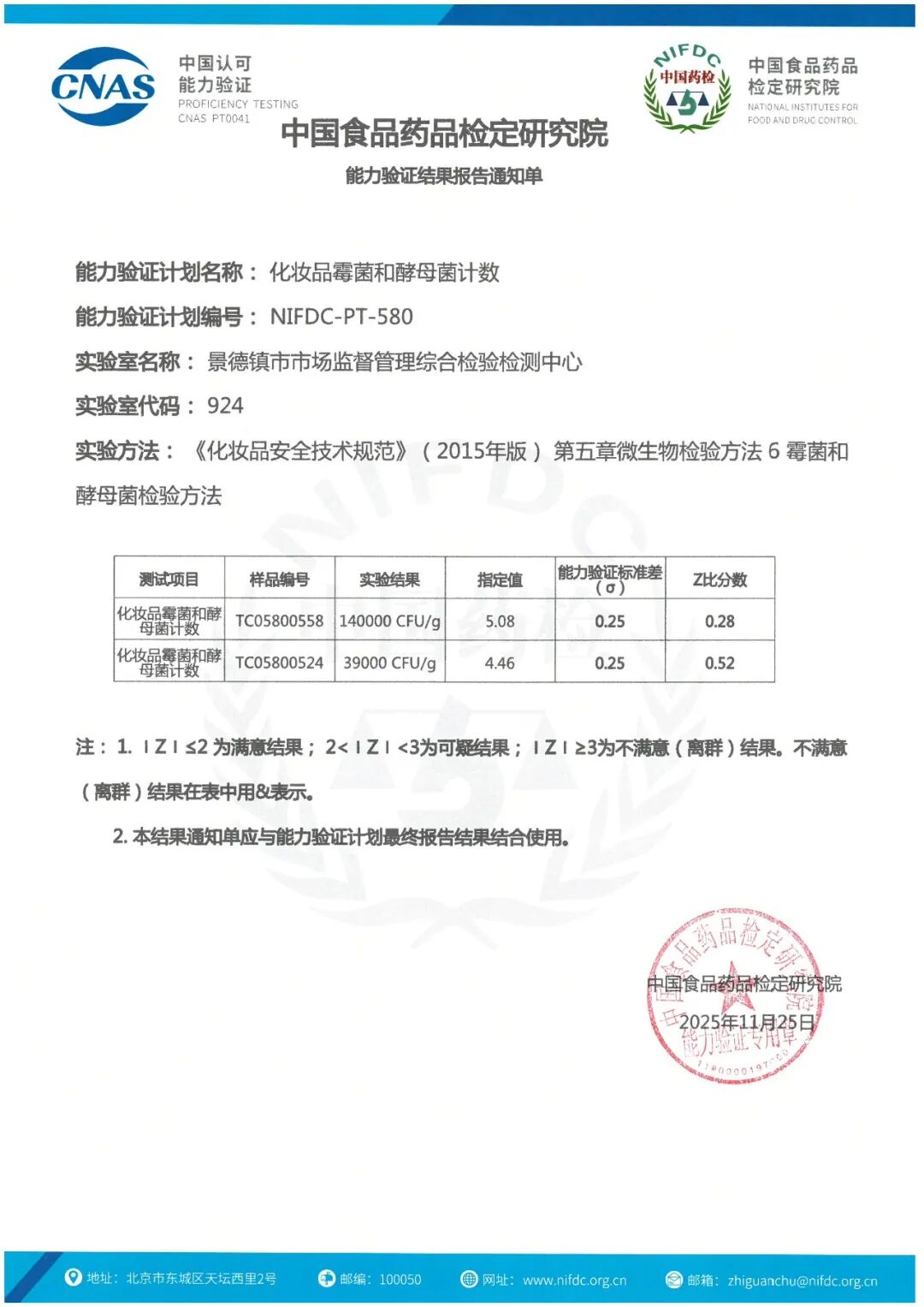近日,中国食品药品检定研究院正式公布2025年度能力验证结果,市市场监管综合检验检测中心在“葡萄糖酸锌含量测定” 与 “化妆品霉菌和酵母菌计数” 两项关键项目中双双斩获 “满意” 评价,标志着中心在食品营养成分检测与化妆品安全监测领域的技术实力,通过国家级权威核验。