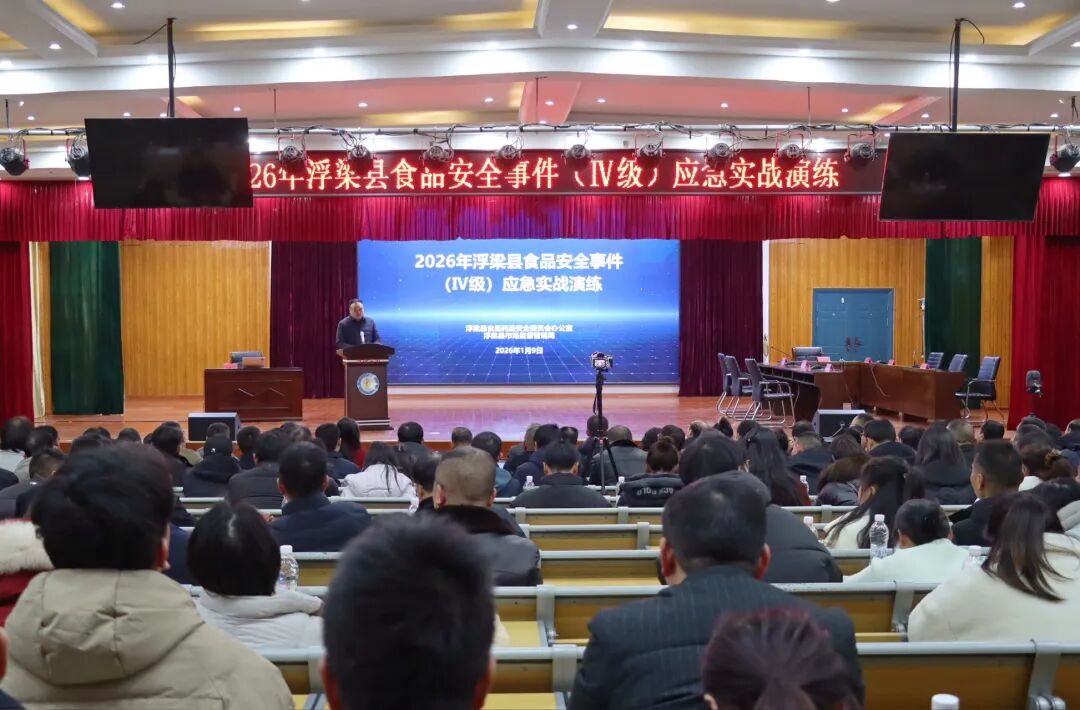 1月9日,2026年浮梁县食品安全事件(Ⅳ级)应急实战演练在浮梁三小报告厅举行。市市场监督管理局局长幸双钱出席并点评演练成果,县委副书记、县长胡贵明出席并讲话。市市场监督管理局副局长林春杰、副县长黄晓红等出席活动。