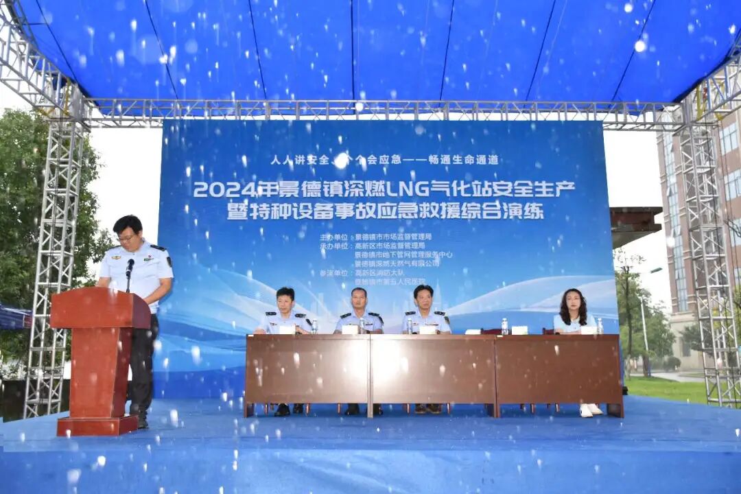 为持续推进市场监管领域安全生产治本攻坚三年行动和城镇燃气安全整治走深走实,检验特种设备事故应急救援机制,提升应急管理能力,按照“安全生产月”活动安排,6月28日,由景德镇市市场监管局主办,高新区市场监管局、景德镇市地下管网管理服务中心、景德镇深燃天然气有限公司承办的,主题为“人人讲安全、个个会应急——畅通生命通道”2024年景德镇深燃LNG气化站安全生产暨特种设备事故应急救援综合演练在景德镇市高新区景德镇深燃天然气有限公司场站成功举行。
