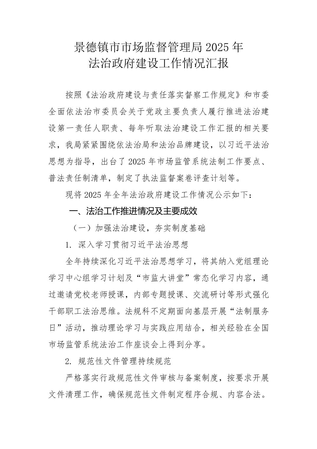 景德镇市市场监督管理局2025年法治政府建设工作情况汇报
