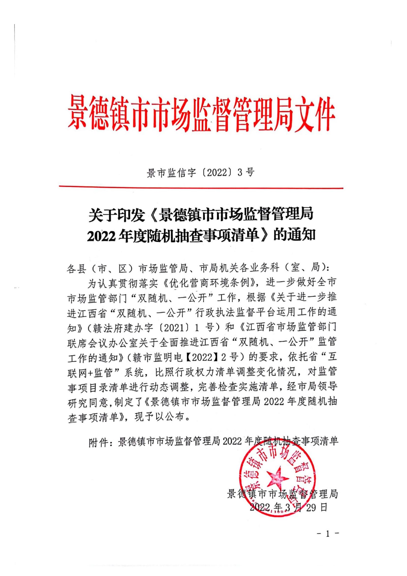 关于印发景德镇市市场监管局2022年度随机抽查事项清单的通知.docx
