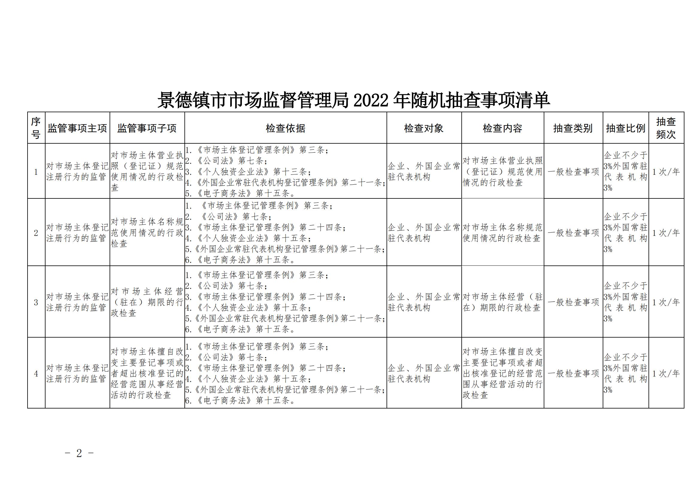 景德镇市市场监督管理局2022年度随机抽查事项清单