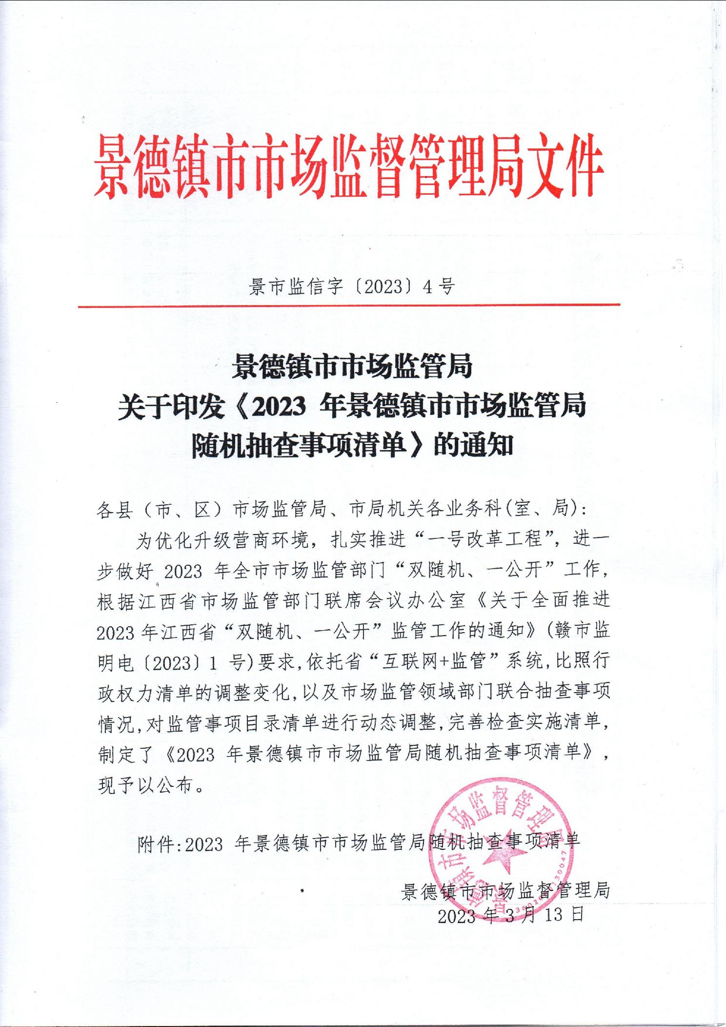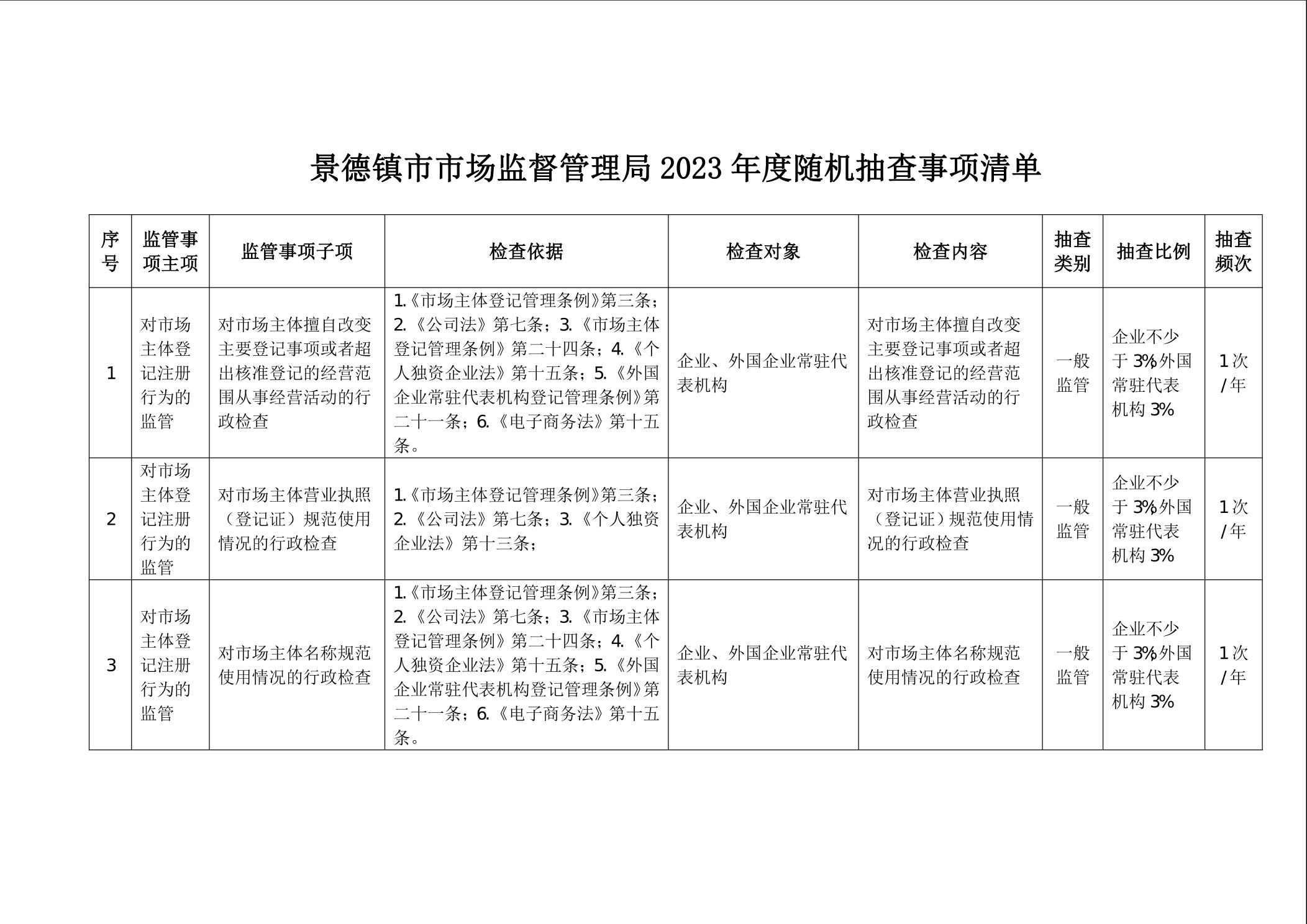 景德镇市市场监管局关于印发2023年度随机抽查事项清单的通知