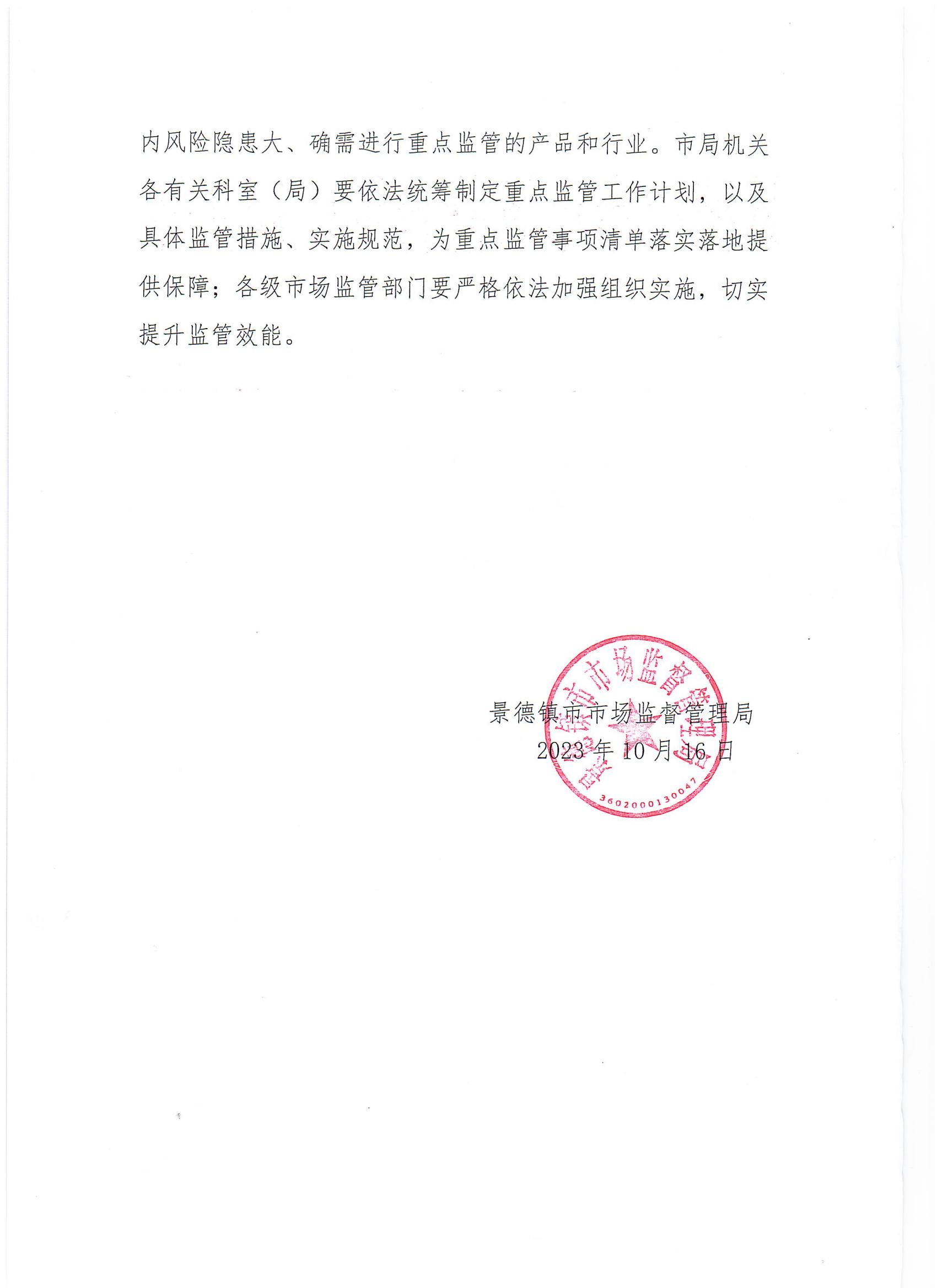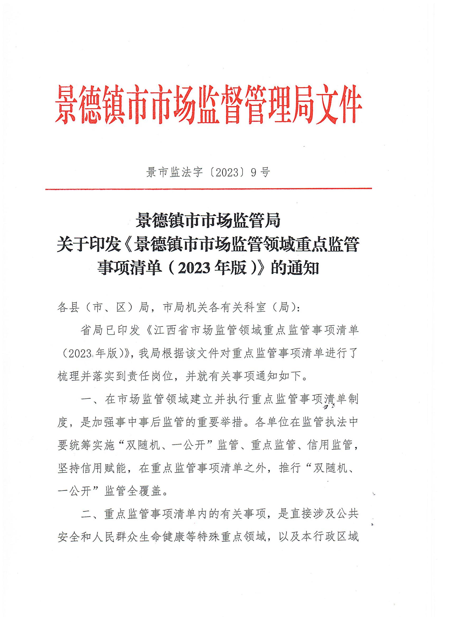 景德镇市场监管局关于印发《景德镇市市场监管领域重点监管事项清单(2023年版)》