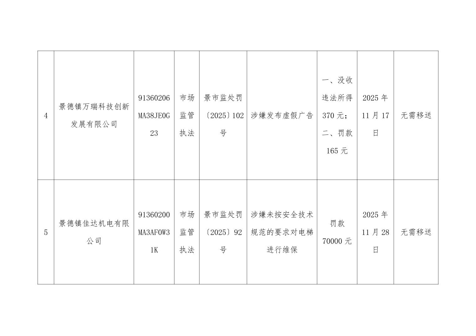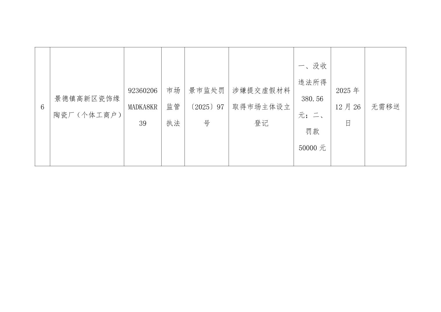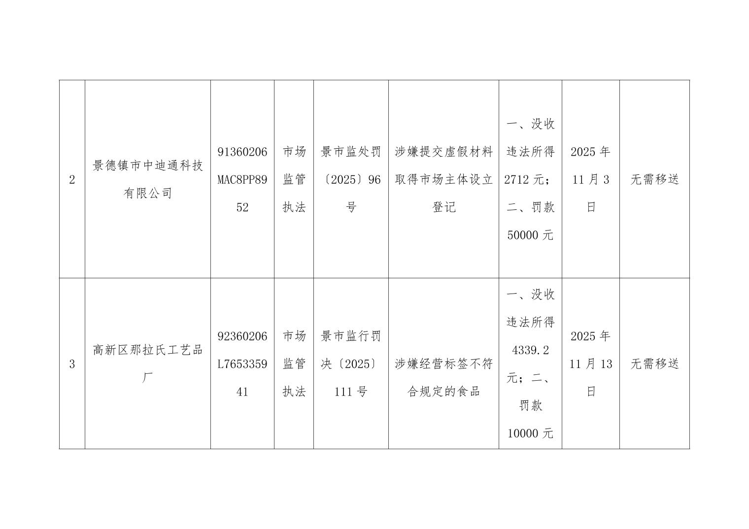 2025年第4季度高新区市场监督管理局行政处罚案件信息台账
