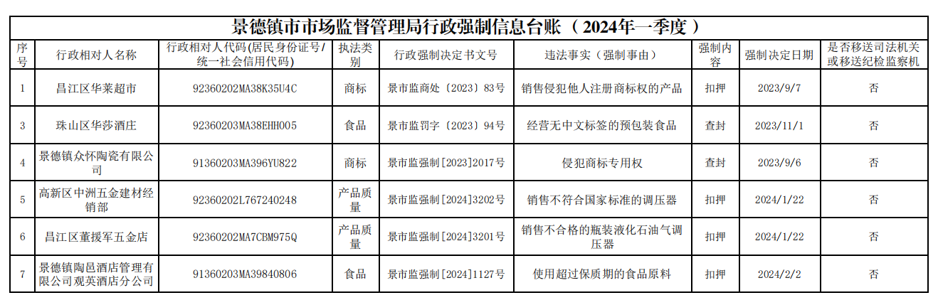 景德镇市市场监督管理局2024年行政强制信息公开(1月-3月)