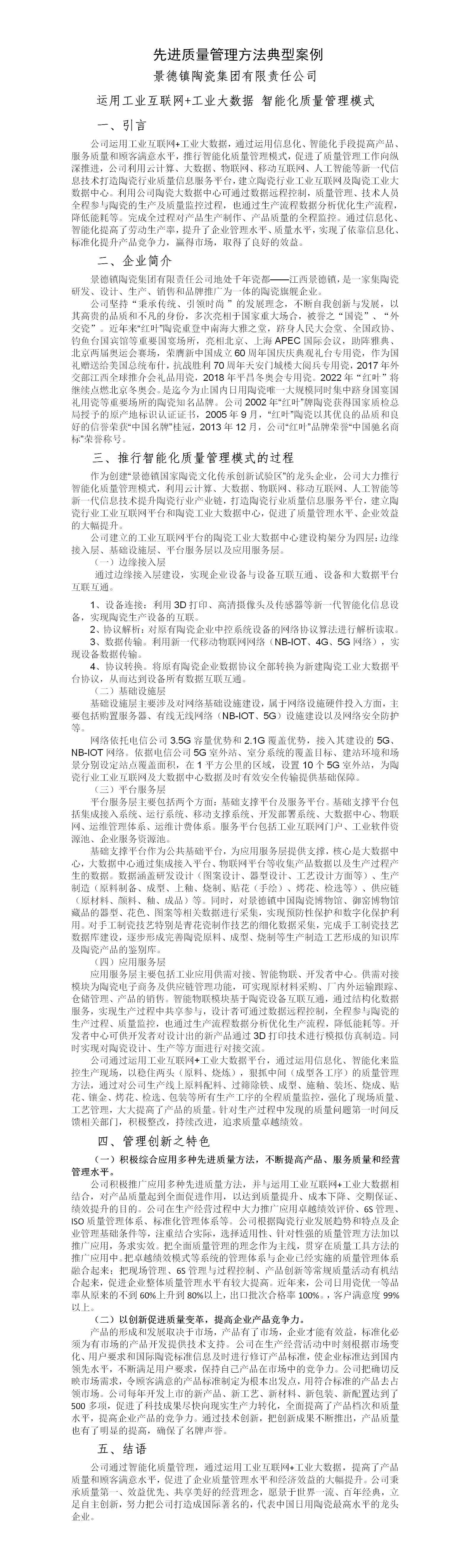 运用工业互联网+工业大数据 智能化质量管理模式(景德镇陶瓷集团有限责任公司)