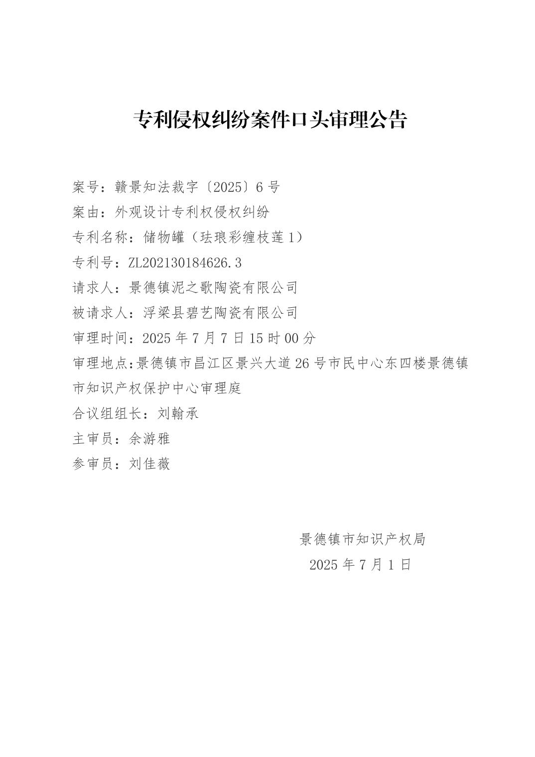 专利侵权纠纷案件口头审理公告(赣景知法裁字〔2025〕6号)