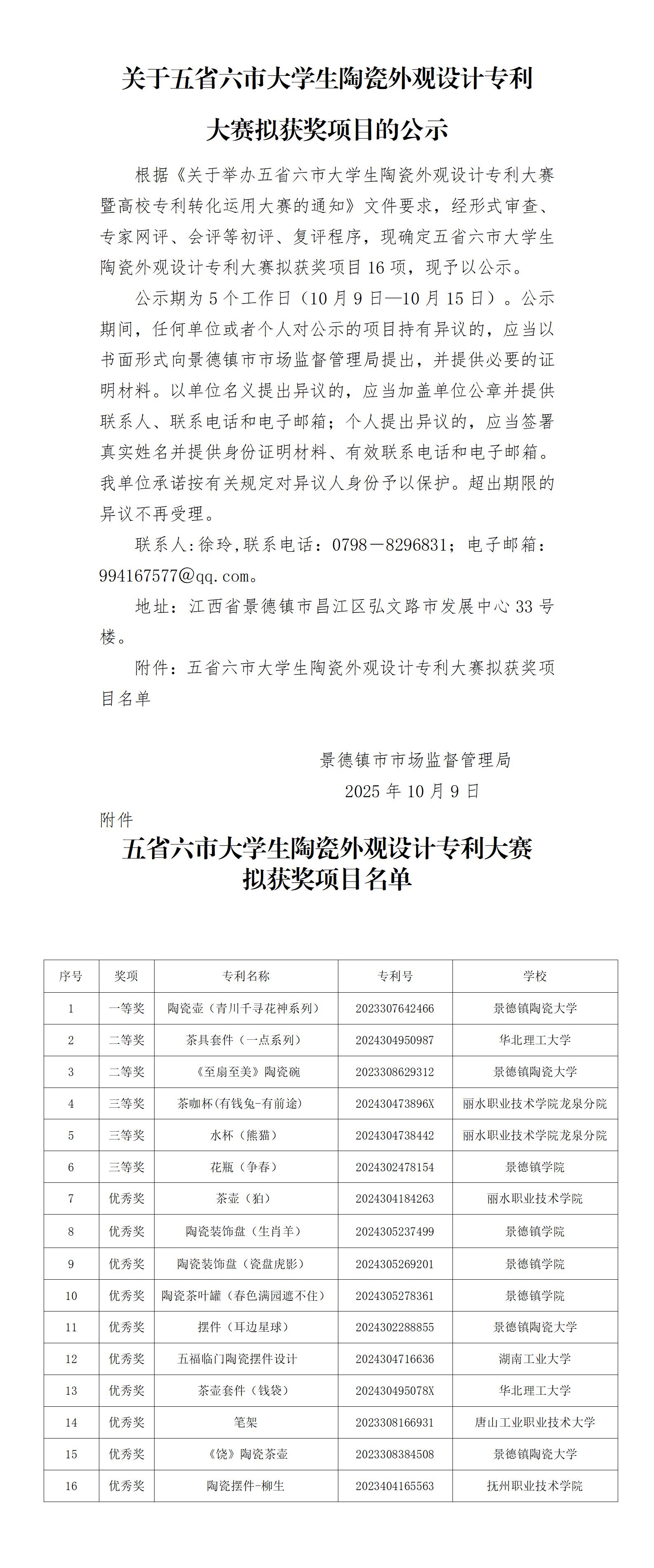 关于五省六市大学生陶瓷外观设计专利大赛拟获奖项目的公示