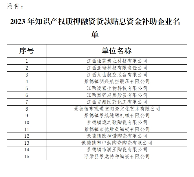 附件:2023年知识产权质押融资贷款贴息资金补助企业名单